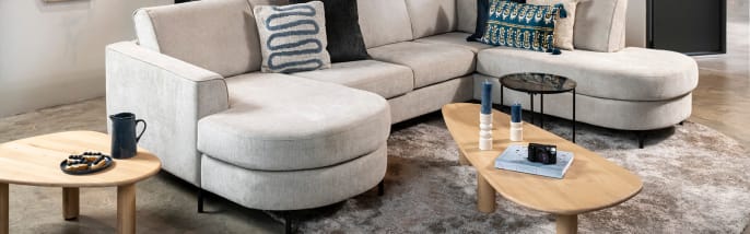 Natürlich gehören auch Tische zur Azulo-Kollektion, und sie weisen die gleiche klare Linienführung wie die Schränke auf. Besonders auffällig ist die Tischplatte der Esstische: Sie hat eine besondere Kieselsteinform (Pebblestone). Die Esstische sind in vier verschiedenen Größen erhältlich, wobei die Beine der drei größten Tische auf zwei Arten befestigt werden können: am Ende des Tisches oder weiter in der Mitte. Die Tischplatte des Couchtisches hat eine eher dreieckige Form. Der Couchtisch ist in zwei Größen erhältlich, die Sie durch den Höhenunterschied von 5 cm wunderbar kombinieren können.